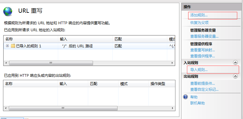 接下来就可以添加自己的重新规则了,添加规则是灵活的,可以自己手写,iis7也支持.htaccess文件导入
