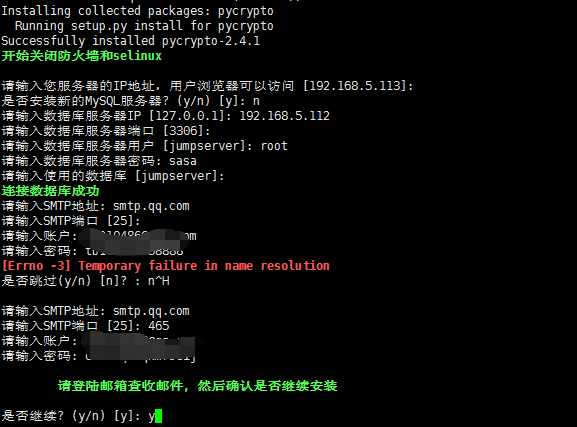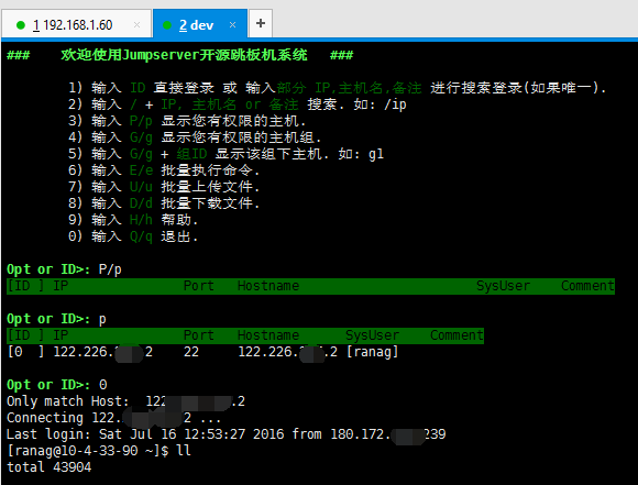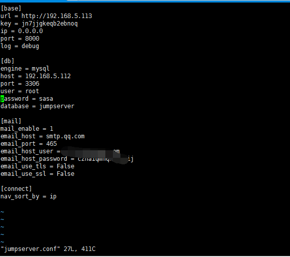 ps:所有的配置信息都可以在项目的跟目录下的jumpserver.conf文件中进行修改,修过配置文件后请重启服务 ./service.sh restart