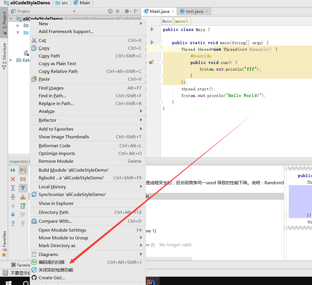 首先如果你想把老的项目统统检查一遍,那么可以使用【编码规约扫描】,右键项目->编码规约扫描,如下