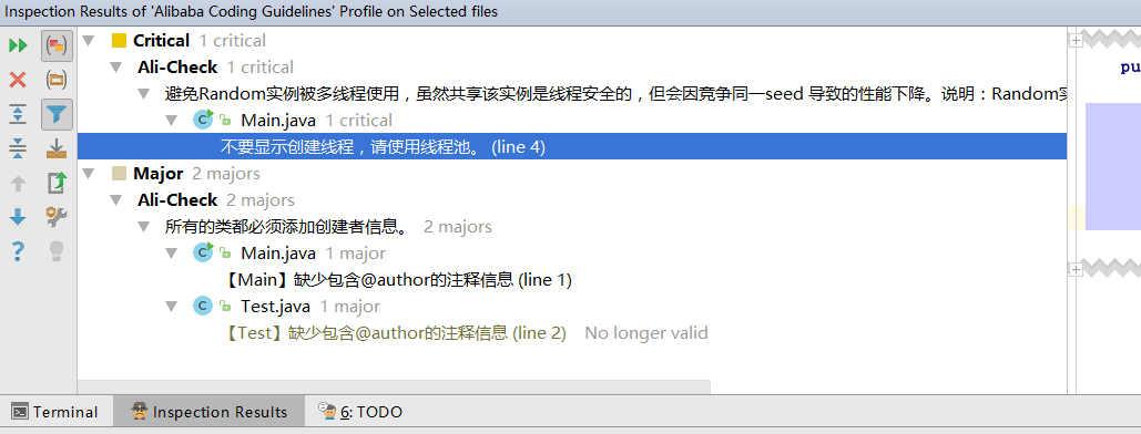 如果你的代码不符合阿里巴巴java规范的话,会有如下的扫描信息,可以据此信息改善我们的代码