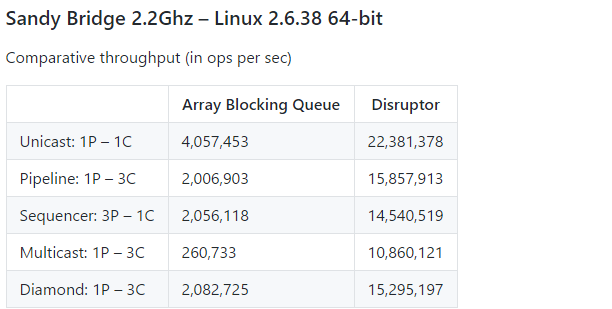 Disruptor是英国LMAX公司开源的高性能的线程间传递消息的并发框架,和jdk中的BlockingQueue非常类似,但是性能却是BlockingQueue不能比拟的,下面是官方给出的一分测试报告,可以直观的看出两者的性能区别:
