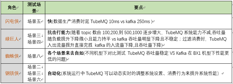 通过对TubeMQ与Kafka进行对比测试分析(详情见《TubeMQ VS Kafka性能对比测试总结V1.0.md》),在1份写入2份并行消费的场景下,从机型、关键配置、系统测试结果数据的对比中我们可以很清晰的看到TubeMQ的性能情况,用大家熟悉的复仇者联盟角色类比,相当于是如下表的情况总结:
