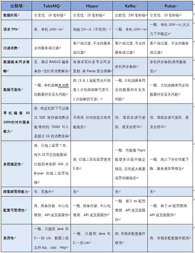 下表是TubeMQ与主流MQ做的一个整体情况对比,便于大家快速粗略的了解TubeMQ与其他的MQ之间的差异。需要注意的是,相比其他MQ,基于成本和异步复制仍有丢数据的考虑,TubeMQ没有纳入多副本实现,相关高可靠的业务应用通过另一套实时多副本MQ Hippo来提供相应服务;TubeMQ在接下来版本中有计划进行多副本的实现处理。如下是相关特性比较: