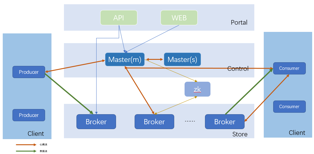Zookeeper: 负责offset存储的zk部分,该部分功能已弱化到仅做offset的持久化存储,考虑到接下来的多节点副本功能该模块暂时保留。