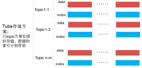 文件结构组织形式调整: TubeMQ的磁盘存储方案类似Kafka,但又不尽相同,如下图示,存储实例由一个索引文件和一个数据文件组成,每个Topic可以分配1个或者多个存储实例,每个Topic单独维护管理存储实例的相关机制,包括老化周期,partition个数,是否可读可写等: