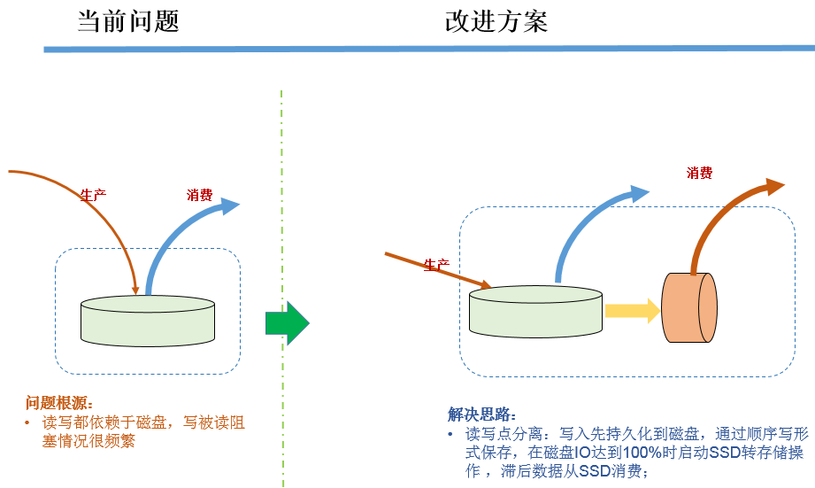 SSD辅助存储: 针对除了由磁盘存储外还带SSD硬件的服务器,我们又做了一层SSD辅助存储,该方案有别于外界系统先将数据存SSD,然后再将数据由SSD转到磁盘的通常做法:按照我们的分析,正常情况下磁盘的顺序读写性能已足够满足数据持久化的需求,磁盘IO到100%时的性能下降主要是由于滞后消费引起,滞后的比例越大影响越大;SSD相比磁盘,虽然读写速度近似内存但写入次数有限,像MQ这种每天大量写的系统很有可能因为SSD突然变得不可写带来系统风险。基于这些考虑,我们采用了动态的SSD转存储消费方案:正常情况下数据走磁盘读写消费;数据挤压情况出现,并且持续的状态触发运维设置的阀值时,滞后的数据消费将被转移到SSD上进行;数据挤压情况解除后,SSD停用数据继续走磁盘进行读写,这样在磁盘IO飙升时候将滞后消费读进行转移,避免读写集中在SATA盘上: