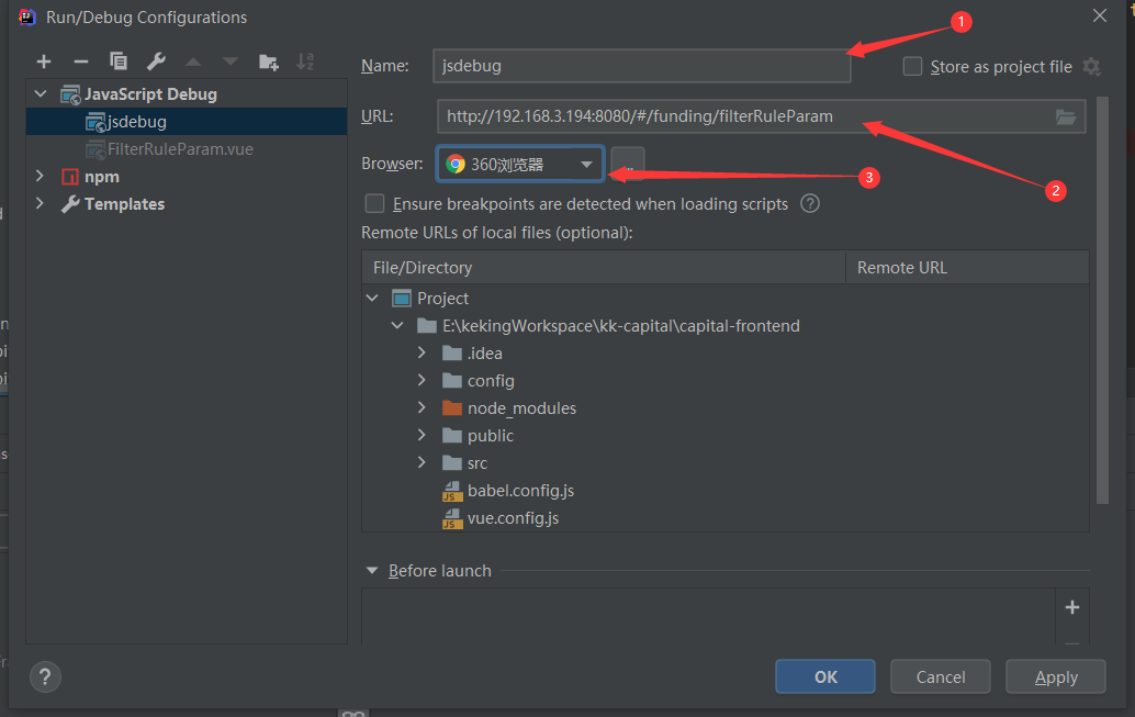 序号2、复制前端项目浏览地址到这里,这里需要说明下,jsdebug并不是帮你启动了一个前端项目,前端项目该怎么启动还怎么启动