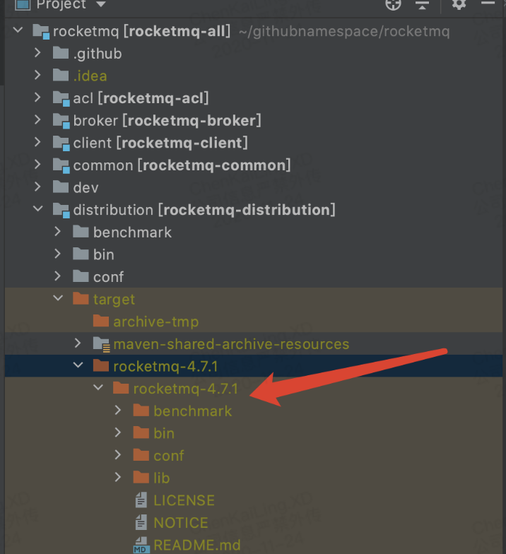 项目地址:https://github.com/apache/rocketmq ,从这个地址下载项目后,导入到IDEA开发工具,执行mvn install,生成安装RocketMQ包,生成成功后,在distribution模块下,会有如下目录,这个目录等下会用到