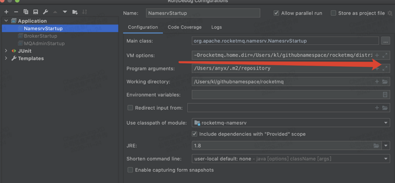 这个时候就需要第一步生成的目录,拷贝/Users/kl/githubnamespace/rocketmq/distribution/target/rocketmq-4.7.1/rocketmq-4.7.1目录,在IDEA的运行设置界面,添加如下参数: