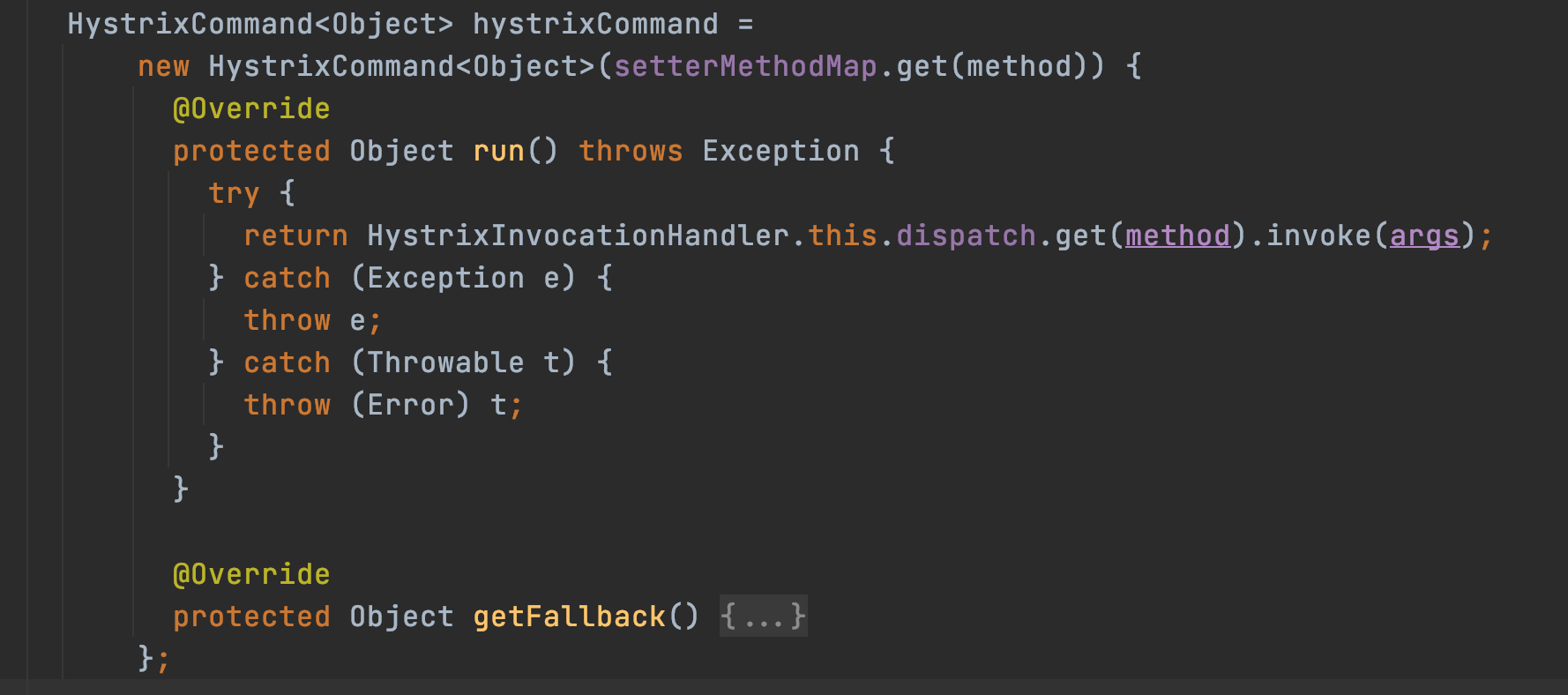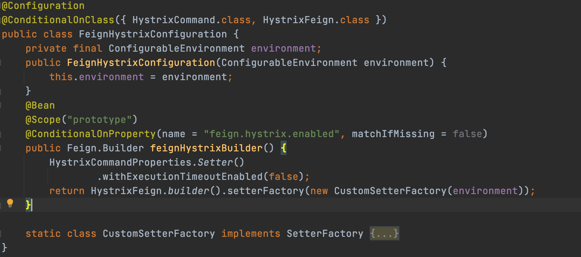这里是Hystrix在feign框架下加载的总入口。这个默认的构建器Builder中,有一个默认实现的SetterFactory,这个SetterFactory专门负责传递参数给Hystrix初始化HystrixCommand用。可以看到这里Bean的实例化加上了@ConditionalOnMissingBean条件约束,既我们可以自定义实现Hystrix的构造器,覆盖这里的实现,在自定义的构造器中,可以通过自定义实现SetterFactory,来注入任意的配置。这个是实现Hystrix配置自定义加载的方式之一,不过不推荐,没必要破坏spirng现有的这种结构,而且代码也会比较冗长(下面{...}省略了一百多行配置处理代码,用来兼容Hystrix现有配置定义),看起来如下: