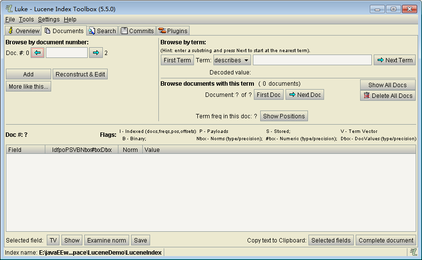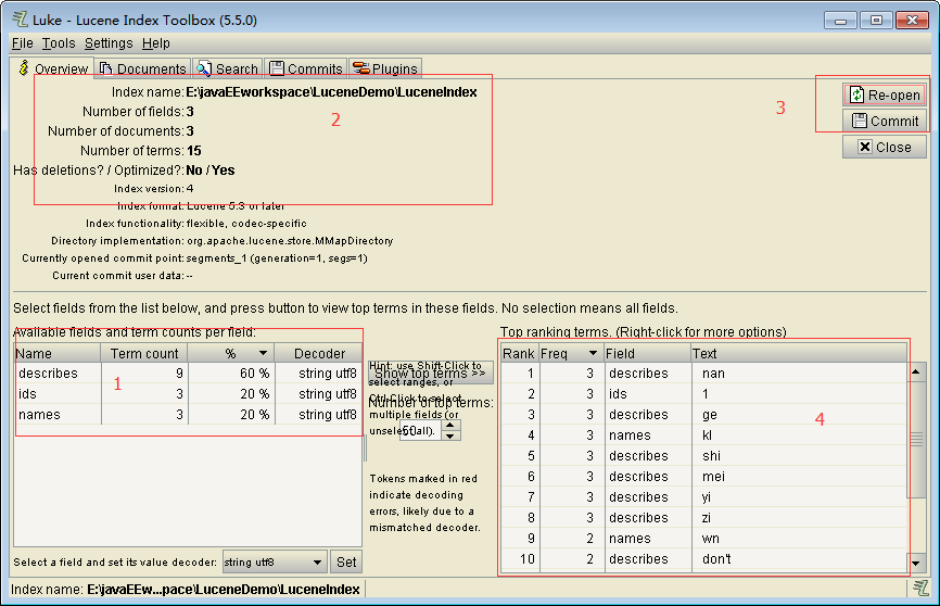 2.处信息是一个统计区,列出了有几个Document,Document有几个FIeld,总共多少个分词