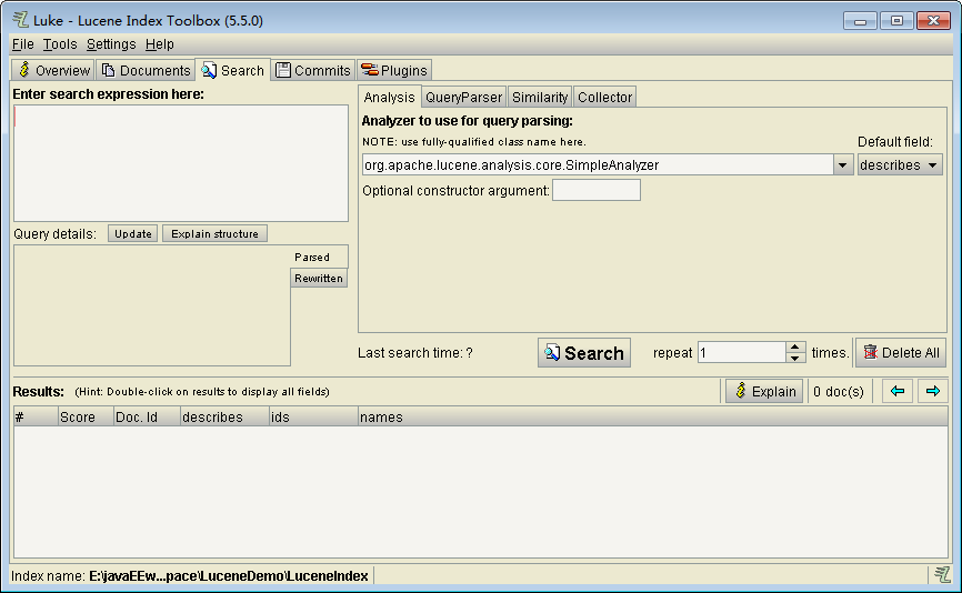 search选项卡是我认为最有用的一个界面了,其中我们可以在这里进行索引的搜索测试,可以编写最的lucene搜索语句,然后可以看到语句解析后的query树,这样就可以知道为什么我们有些查询会查询不到我们想要的信息了,然后还可以选择进行搜索的分词器、默认字段和重复搜索次数的(可以通过多次搜索来获取平均一个搜索过程的耗时长短,这个对查询的性能测试时非常有用的),然后下面的listview中就会列出一个搜索的的文档的所有保存的(store)字段的值,下面可以看到查询花费的时间。详情如下图