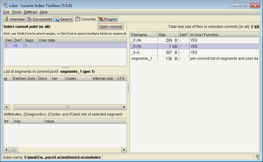 Commits选项卡就是用来查看每个索引相关文件的一些属性的界面,具体的话,可以通过这个界面分析下索引文件的多少大小,是否需要优化或者合并等等。详情如下图