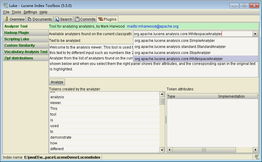 最后一个plugins选项卡,就是可以看到luke提供的各种插件,我认为比较有用的还是那个分词工具,提供一个分词的类,然后下面文本框输入一段文本,然后就可以让这个工具帮你分词,你可以看到详细的分词信息。详情如下图