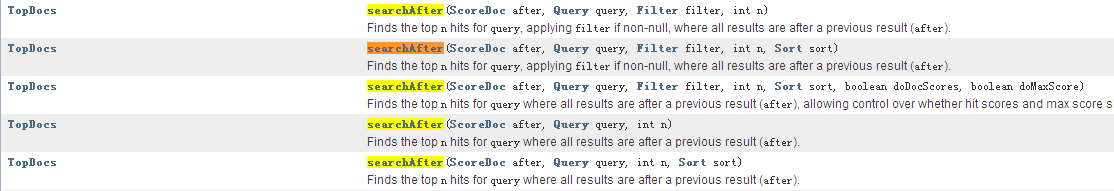 searchafter有多个重载的方法,其中有些searchafter方法Lucene已不推荐使用了,用的多的就searchAfter(final ScoreDoc after, Query query, int numHits)