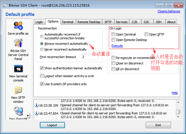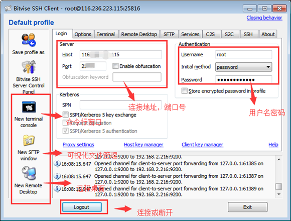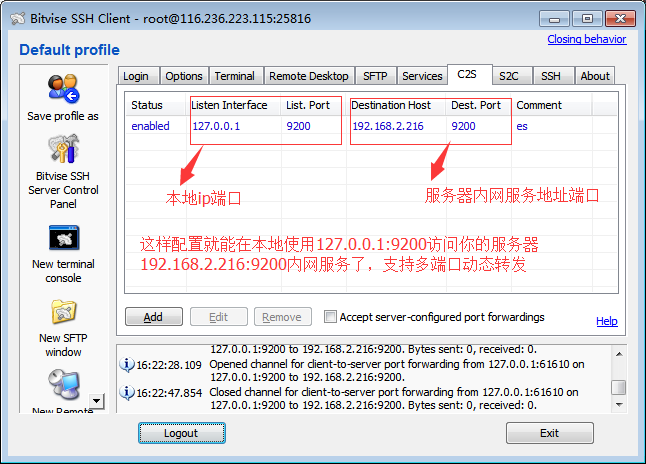 4.支持动态端口转发(这个特性使你可以轻松访问你服务器的内网ip端口服务,有很多服务为了安全性考虑都是内网访问的,有了这个特性,你可以轻松的再你的本机上访问服务器内网ip服务)