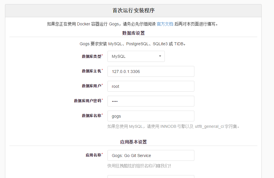 对应你的平台,将项目下载下来后,在项目目录下执行gogs web -port 80 就可以开始你的Gogs的体验之旅了,目前支持mysql,PostgreSQL,SQLite3 或 TiDB,下面是我安装的截图,大家直观感受下